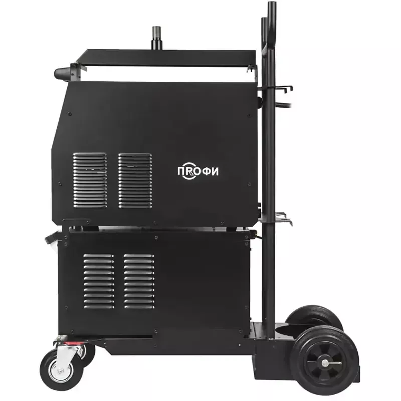 Полуавтомат ПРОФИ MIG 500 DP SYN FW поставляется с блоком водяного охлаждения объемом до 10 литров и с тележкой-платформой, для легкого и комфортного перемещения и эксплуатацию оборудования. Тележка оснащена надежной усиленной конструкцией. На нее можно установить сварочный источник, выносной подающий механизм, блок жидкостного охлаждения и газовый баллон объемом 40 литров.