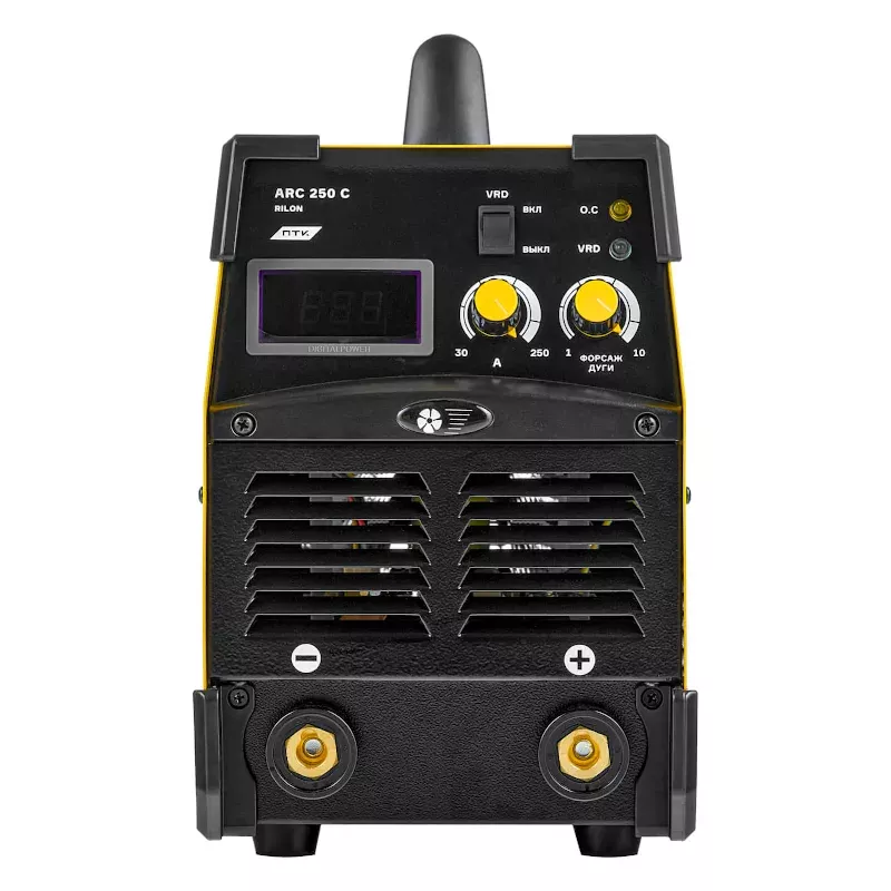 Функция VRD обеспечивает безопасность сварщика за счет снижения напряжения до минимального значения при замыкании сети. Оборудование оснащено датчиком температуры с индикатором перегрева. В случае превышения допустимого уровня нагрева срабатывает системы защиты, которая запускает вентилятор и отключает устройство во избежание его поломки. После остывания и стабилизации температуры сварочный инвертор ПТК RILON ARC 250 C НАКС автоматически возобновляет работу.