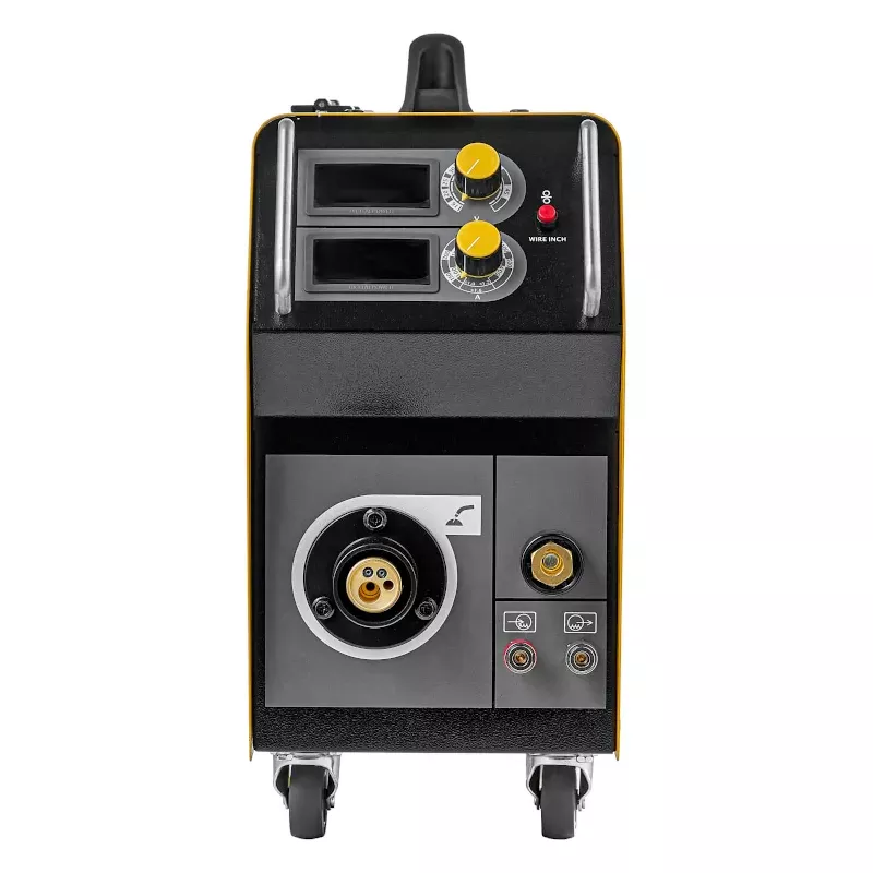 - На передней панели аппарата находится многофункциональный дисплей с возможностью регулировок силы сварочного тока, сварочного напряжения, индуктивности, регулировки скорости подачи проволоки и других параметров сварочного процесса.