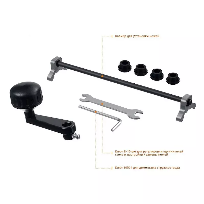 Для обработки заготовок разной высоты есть регулировочная ручка. С помощью ее прокрутки рабочую платформу можно опустить вниз или поднять. Сбоку на корпусе есть специальная шкала для определения точного значения.