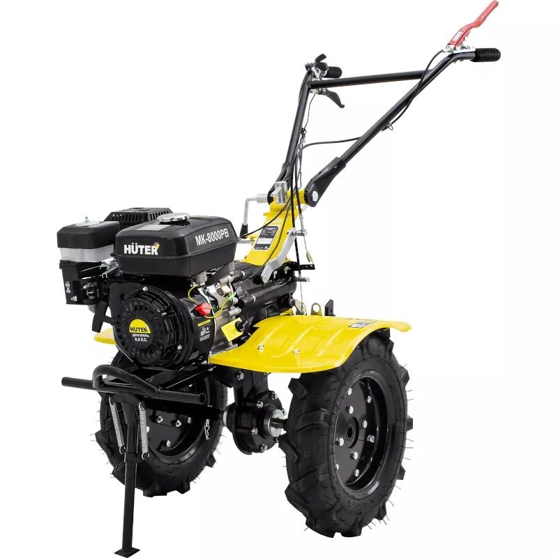 Сельскохозяйственная машина Huter MK-8000PВ полностью контролируется с рабочего места. На удобных прорезиненных рукоятках расположены все основные органы управления: тумблер газа, кнопка запуска двигателя, а также переключатели заднего и переднего хода. Режущий механизм приводится в действие только при зажатых рычагах сцепления, благодаря чему исключается непроизвольное движение машины.
