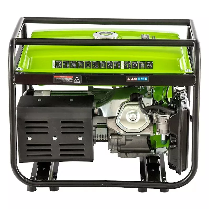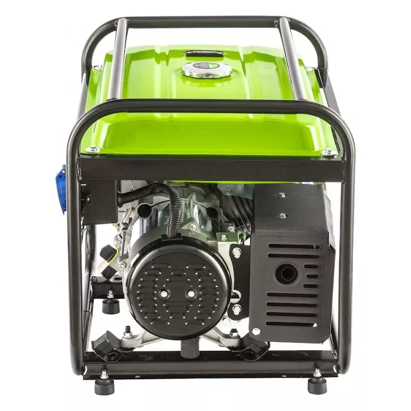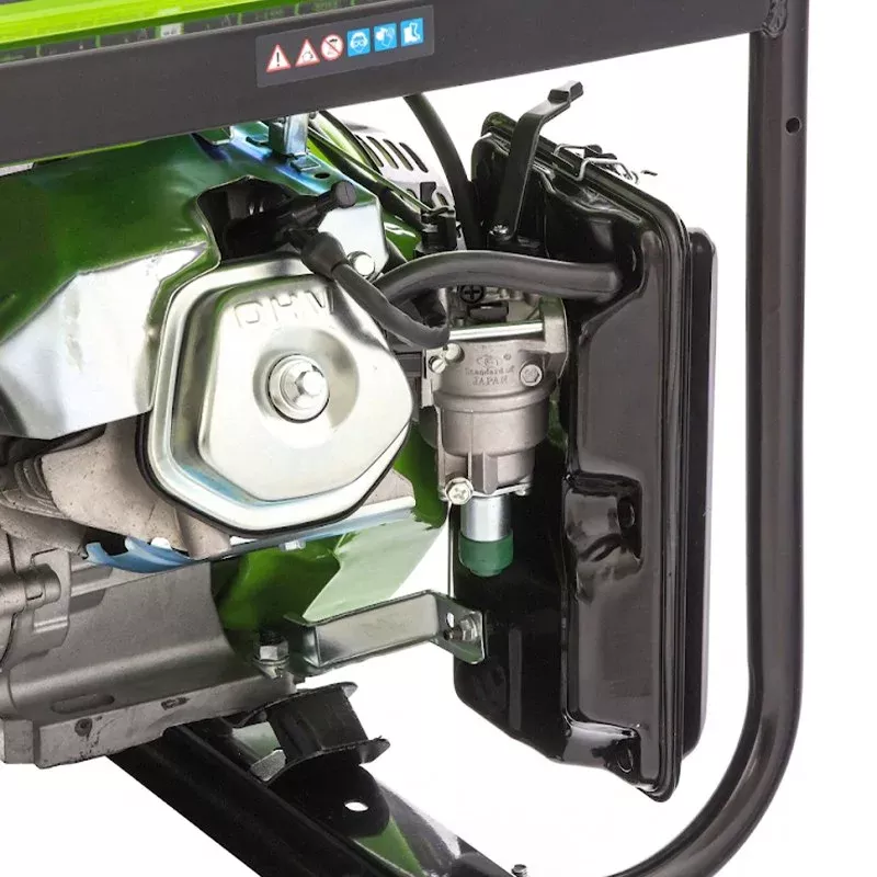 Бензогенератор Сибртех БС-8000 открытого типа не перегревается и обеспечивает беспрепятственный доступ ко всем важным узлам для техобслуживания. В качестве защиты от случайных механических повреждений используется металлическая рама. Ее верхняя часть образует ручки для переноски, а нижняя служит устойчивым основанием. Обмотка синхронного альтернатора двигателя выполнена из меди. Этот материал намного долговечнее алюминия и не подвергается сильному нагреву во время работы. В верхней части корпуса расположена широкая горловина для удобной заправки топливного бака. Крышка легко откручивается одной рукой.