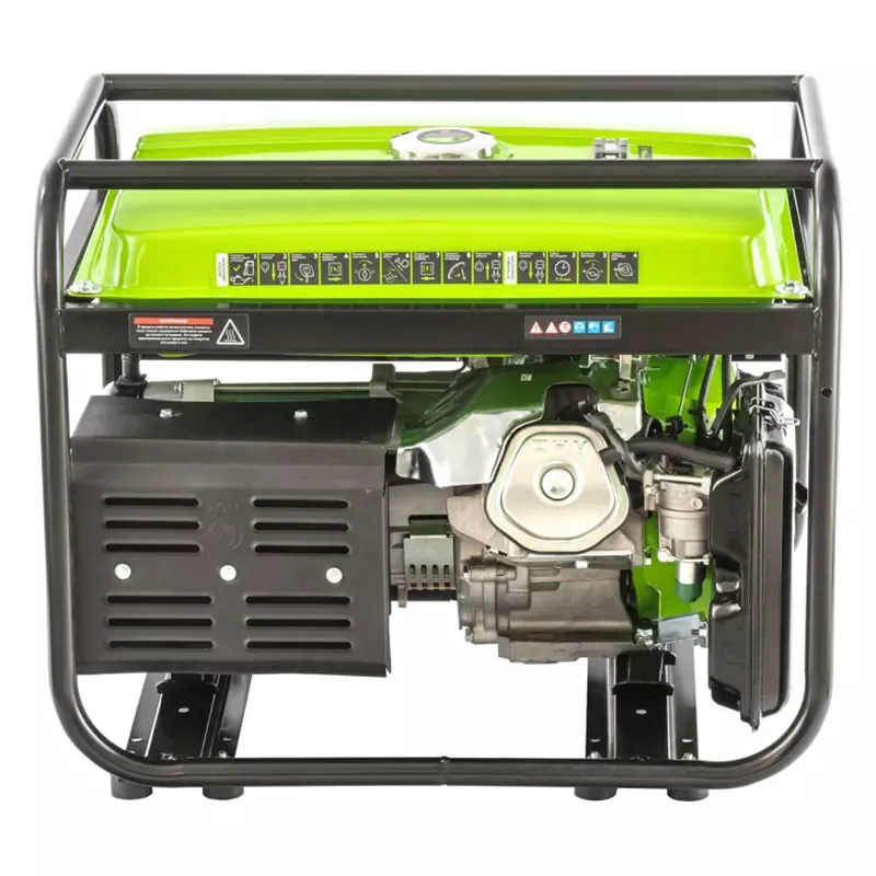 Открытая металлическая рама огибает весь корпус, защищая внутренние узлы от механических повреждений. Ее нижняя часть служит опорой, а верхняя — держателем для переноски электрогенератора. Амортизаторы гасят вибрацию и повышают устойчивость генератора.