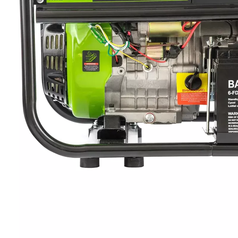 Бензиновый генератор оснащен 4-тактным мотором объемом 420 см3 мощностью 15,1 л.с., вырабатывает однофазный переменный ток частотой 50 Гц. Электростартер максимально упрощает запуск двигателя. Аккумулятор для него входит в комплект поставки. После долгого простоя или в случае разрядки аккумулятора двигатель можно завести с помощью ручного стартера. За счет контроля напряжения электрогенератор подходит для питания компьютеров и другой чувствительной техники.