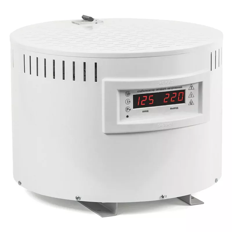 Стабилизатор напряжения SKAT STP 10000 с шестнадцатью ступенями регулировки и максимальной мощностью нагрузки до 10 кВа работает с высокой точностью в 3,5 %. В основе устройства тороидальный трансформатор и микропроцессор с алгоритмом «мягкого переключения» и функцией самодиагностики.
