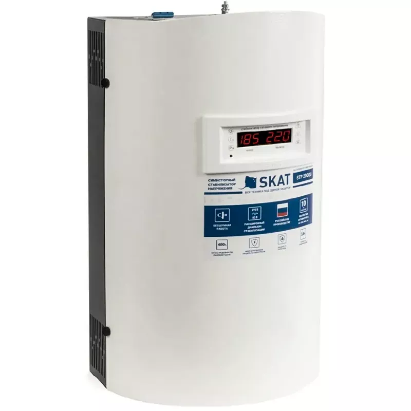 Однофазный стабилизатор напряжения SKAT STP 20000 H имеет встроенный быстродействующий автоматический выключатель для защиты питающей сети от короткого замыкания и перегрузки. Противопожарный датчик срабатывает при перегреве, отключая нагрузку. Светодиодные индикаторы на передней панели сигнализируют об аварийных ситуациях.