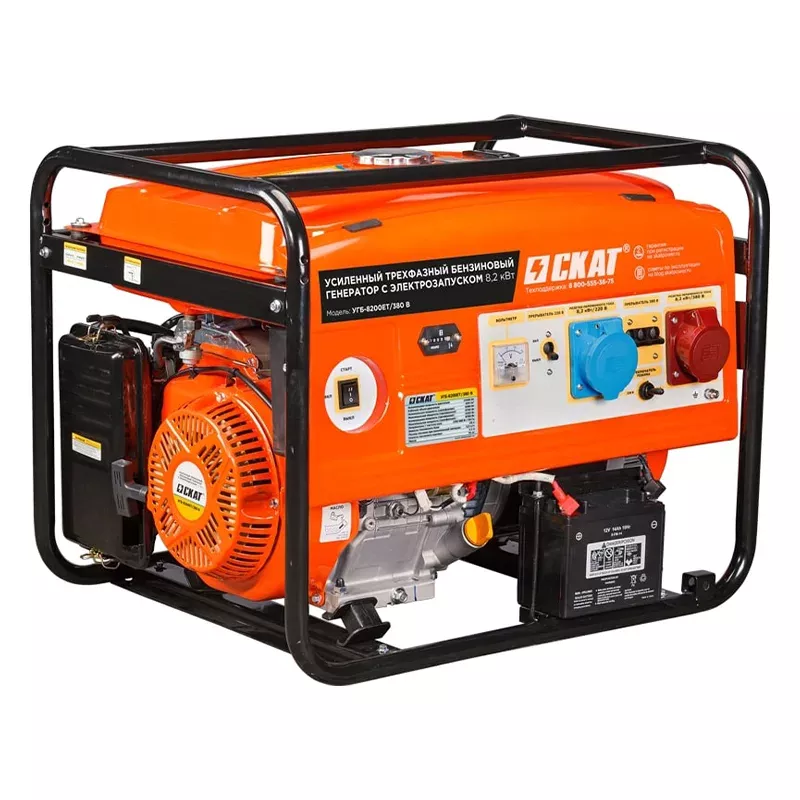 Трехфазный бензиновый генератор СКАТ УГБ-8200ЕT мощностью 8,2 кВт на 380 вольт и 8,2 кВт на 220 вольт представляет собой мобильное оборудование как для бытового, так и для профессионального использования. Служит источником питания различных приборов, когда нет возможности подключится к электросети.