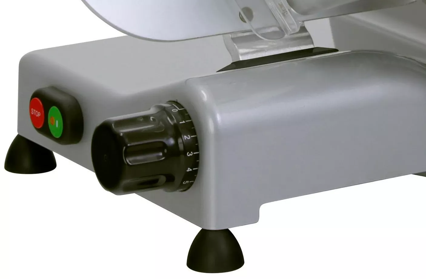 Наличие резиновых ножек в нижней части электрической ломтерезки препятствует вибрации и скольжению, что позволяет быстро и удобно нарезать колбасу, мясо, рыбу. Приборы модели ES 250 являются простыми в применении. Нарезаемые продукты закрепляются в лотке посредством прижимного элемента. Используя рукоятку и ручку толкателя, каретка непрерывно перемещается над острым лезвием вперёд-назад, при этом слайсер имеет плавный ход.