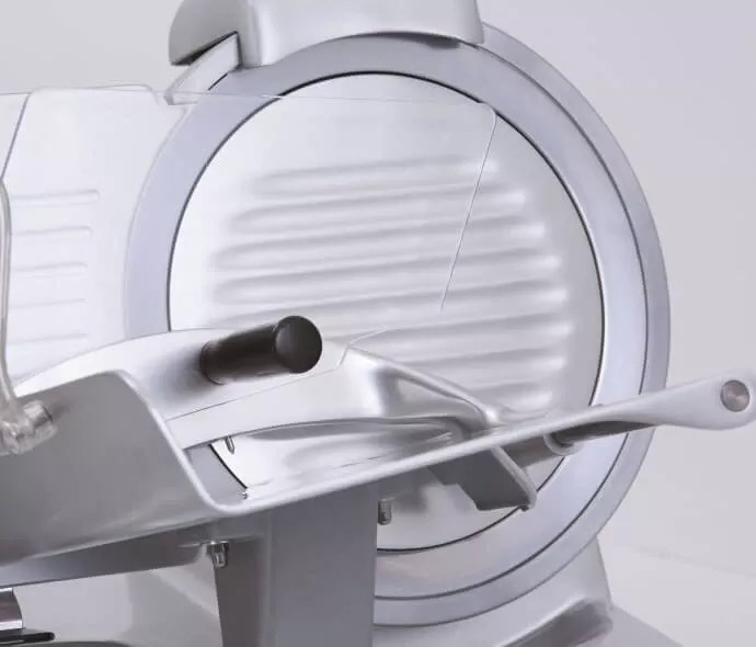 Слайсер полуавтоматический с наклонным ножом для нарезания гастрономических продуктов.