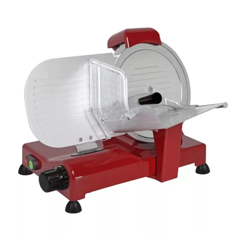 Слайсер Rgv Lusso 300 S-L Prof красный предназначен для красивой и быстрой нарезки салями, ветчины, мяса, сыров, овощей на предприятиях общественного питания и торговли.