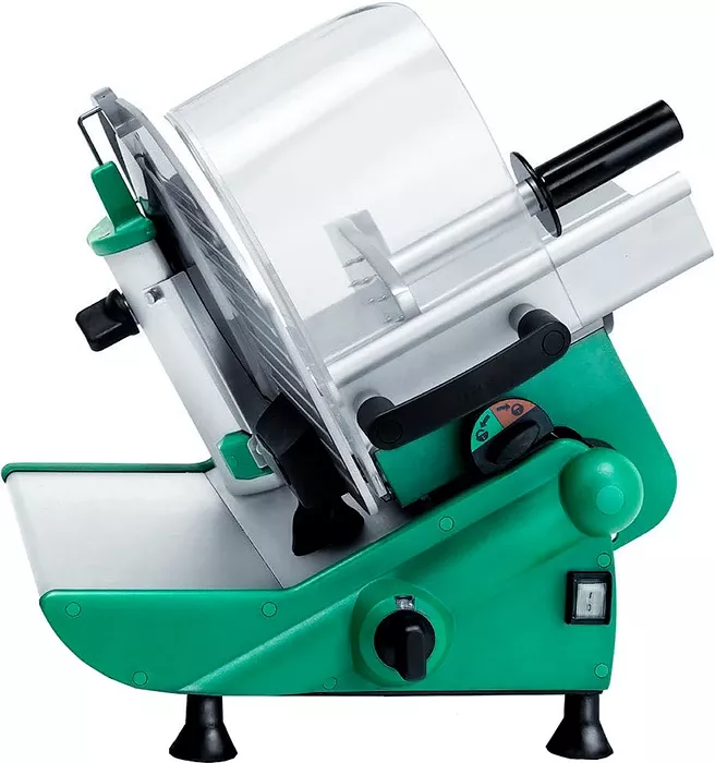 Слайсер работает в полуавтоматическом режиме. Наклонная каретка возвратно - поступательным движением толкается по направлению к вращающемуся дисковому ножу. Продукт, закрепленный на продуктовом столе каретки держателем, под действием сил гравитации давит на нож, что способствует очень быстрой, эстетичной и экономной нарезке.