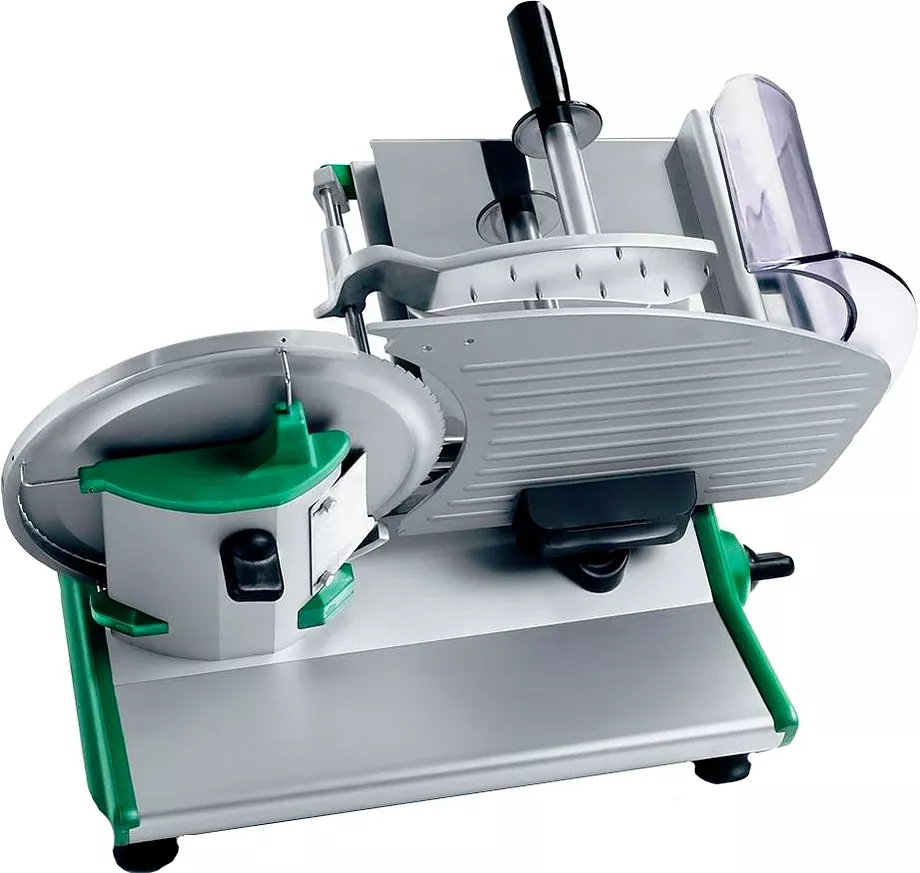 Слайсер работает в полуавтоматическом режиме. Наклонная каретка возвратно - поступательным движением толкается по направлению к вращающемуся дисковому ножу. Продукт, закрепленный на продуктовом столе каретки держателем, под действием сил гравитации давит на нож, что способствует очень быстрой, эстетичной и экономной нарезке.