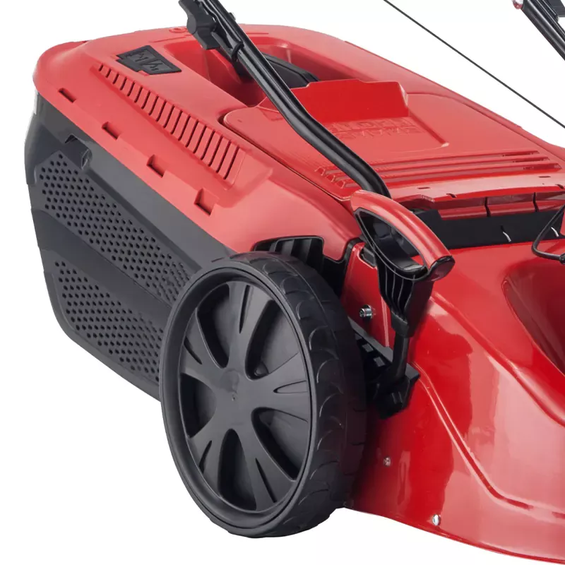 Задние колеса газонокосильной машины Solo by AL-KO 4712 P-A больше передних, что обеспечивает плавный ход даже по неровной поверхности. При этом такая конструкция также облегчает разворачивание модели.