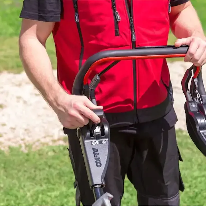 Для комфортной работы рукоятка настраивается по высоте. А для компактного хранения газонокосилки вы можете убрать держатель. В таком виде она практически не займет места.