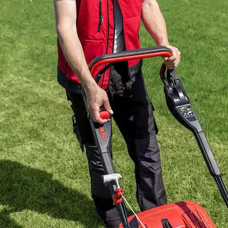 Для комфортной работы рукоятка настраивается по высоте. А для компактного хранения газонокосилки вы можете убрать держатель. В таком виде модель практически не займет места.