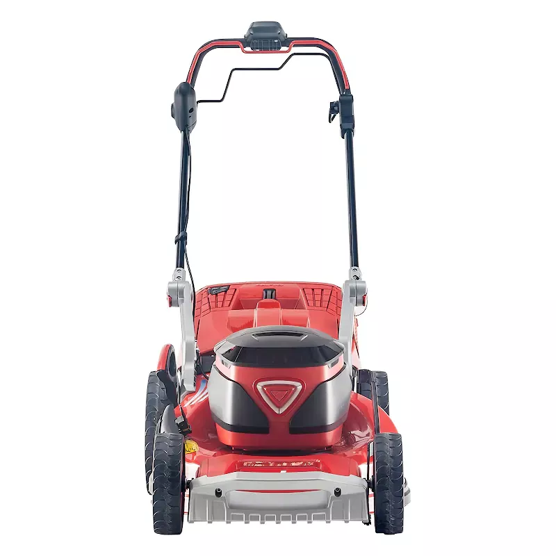 Элементы управления вынесены на прорезиненную рукоятку удобной формы, которую после работы легко сложить для хранения и транспортировки. В передней части корпуса предусмотрена ручка для переноски. Большие колеса размера XXL выполнены из мягкого пластика, имеют глубокий протектор, шарикоподшипники, разный диаметр передней и задней пары для плавного хода, проходимости по высокой траве.