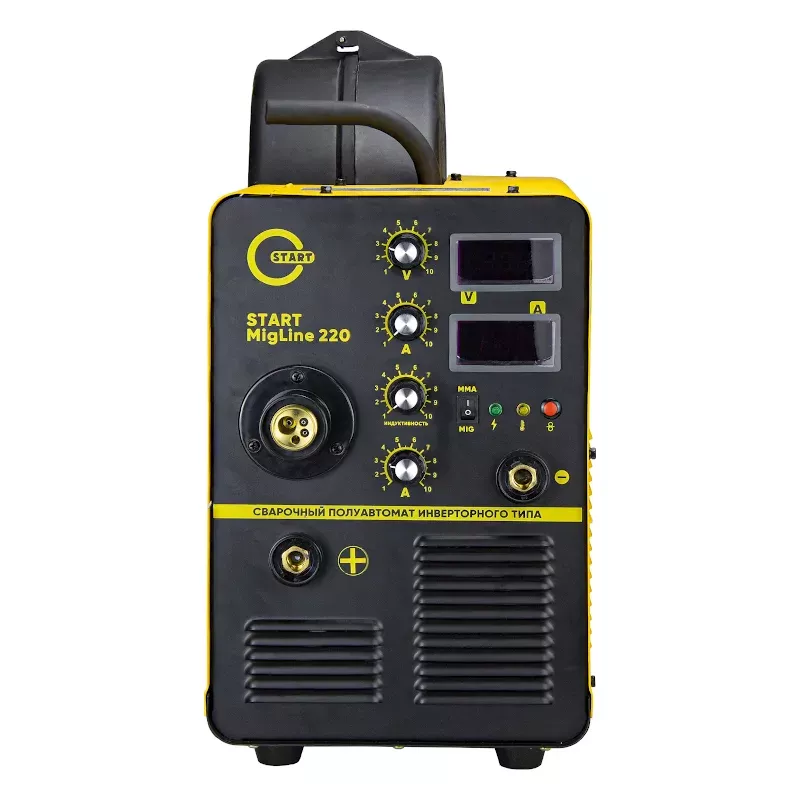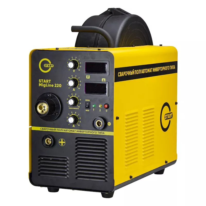 Сварочный полуавтомат инверторного типа START MigLine 220 - легкий и компактный, с выносной катушкой (возможность использования 15 кг катушки) предназначенный для полуавтоматической сварки в среде защитных газов (MIG/MAG) и ручной дуговой сварки MMA.