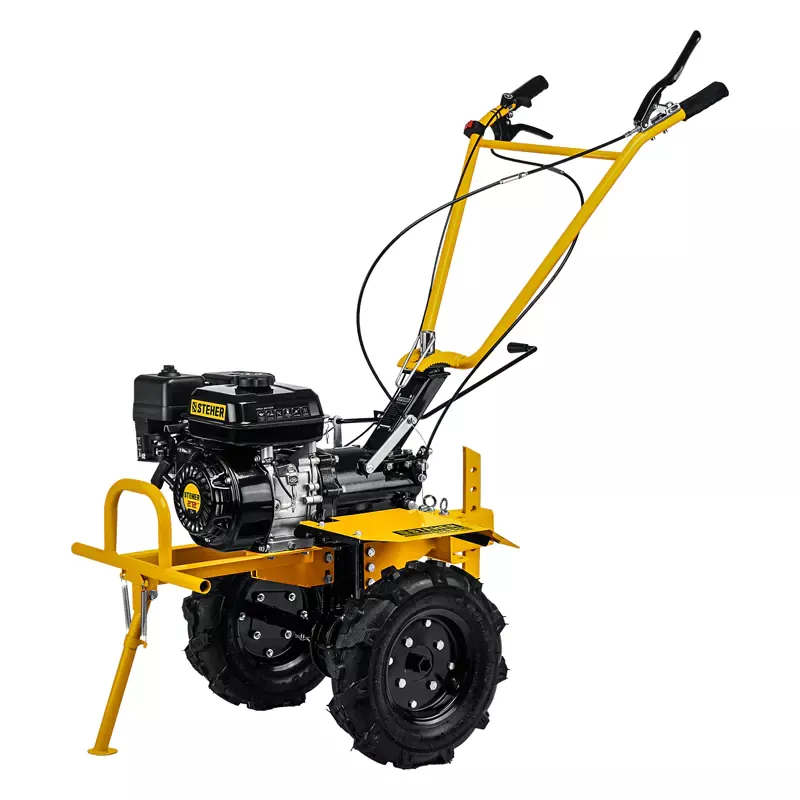 С трехступенчатой коробкой передач легко подобрать оптимальный режим для каждого вида работ и типа почвы. Скорость вращения приводного вала на первой передаче достигает 93 об/мин, на второй — 130 об/мин. Задняя скорость 68 об/мин повышает маневренность мотоблока STEHER GTS-500, позволяет возделывать даже небольшие участки. К валу отбора мощности можно подсоединить плуг, борону, тележку, косилку и прочее навесное оборудование.