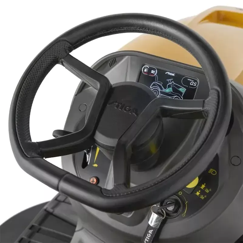 Она оснащена интеллектуальным 5.5" широкоэкранным дисплеем, который показывает четкую и легко читаемую информацию об оборотах двигателя, заряде аккумулятора, уровне масла и топлива, а также данные функции оптимальной зоны кошения, которая повышает эффективность работы. Трактор поставляется с самым широким в этом классе режущим механизмом шириной 121 см с тремя ножами, который обеспечивает непревзойденную производительность на больших участках.