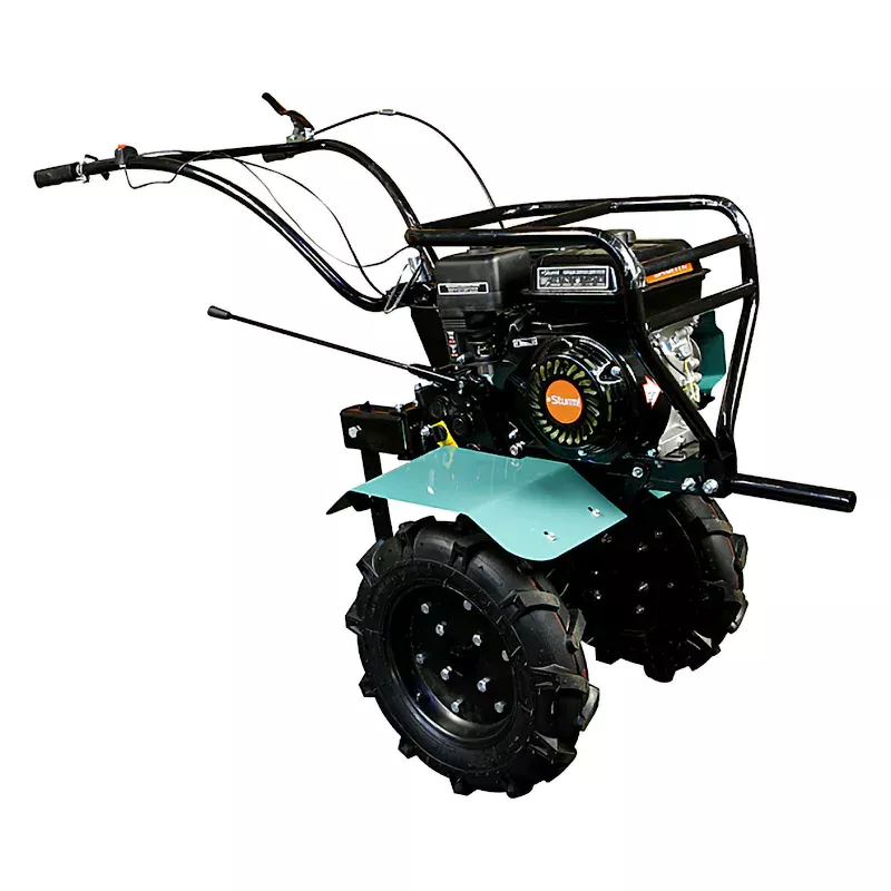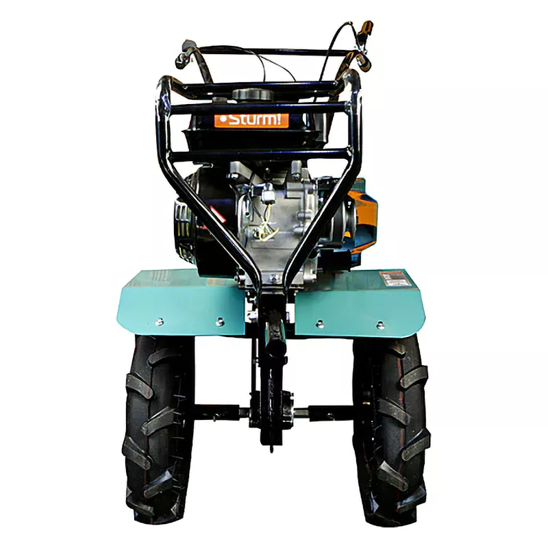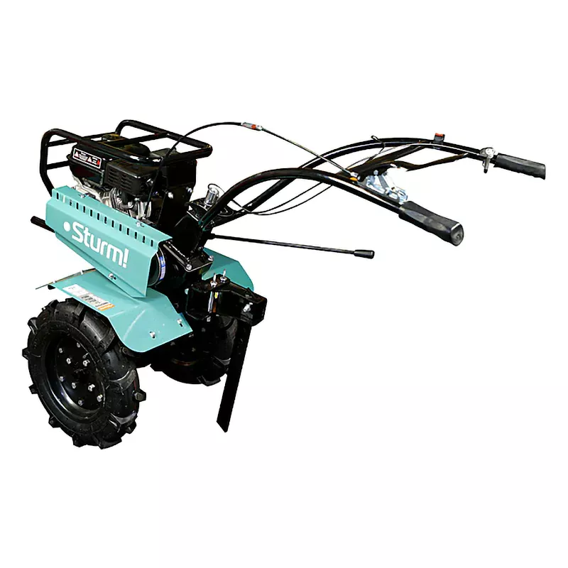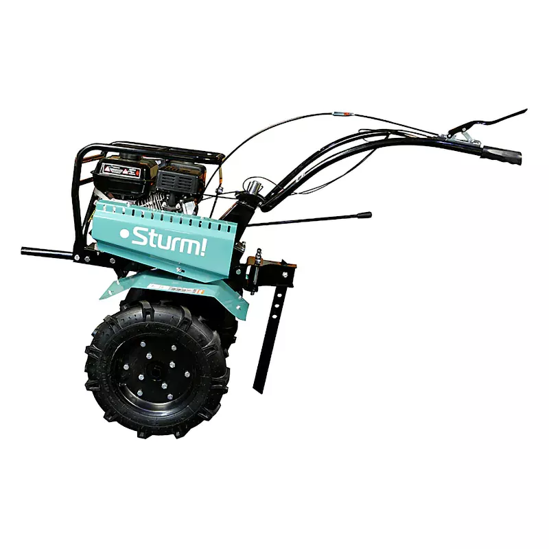 Мотоблок бензиновый Sturm! GK837CI10 — 3-х скоростная модель (понижающая, основная и повышающая) с чугунным редуктором и формованными крыльями. Удобный руль с регулировкой вверх-вниз/влево-вправо.