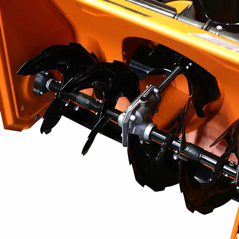 Зазубренный шнек первой ступени успешно измельчает слежавшийся снег и может справиться даже с настом толщиной до 2 см. Высокооборотистая вторая ступень снегоуборочного агрегата отбрасывает снег на расстояние до 11 м.