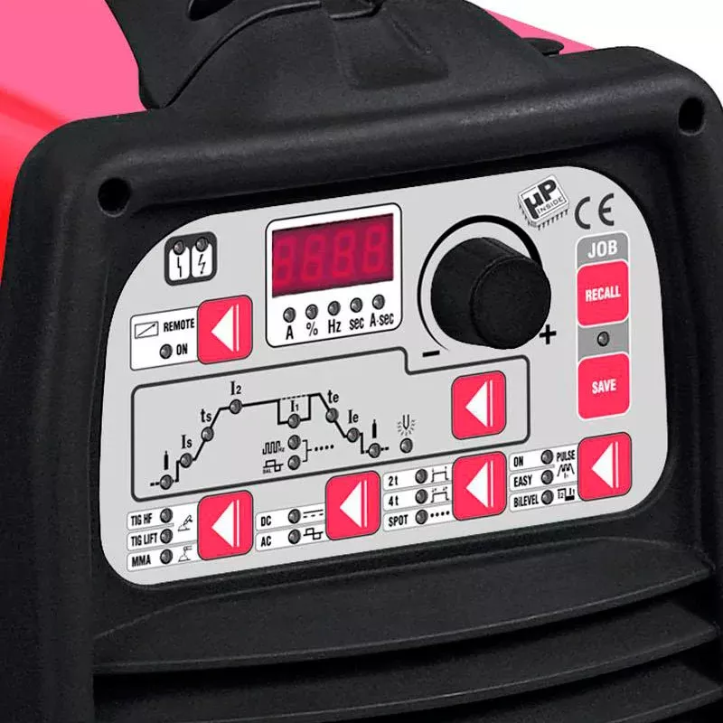 - регулирование TIG: двухуровневое регулирование, начальный/конечный ток, время контактной сварки, подача газа перед-после сварки, плавный подъем и спад тока, баланс DC, частота вольны,