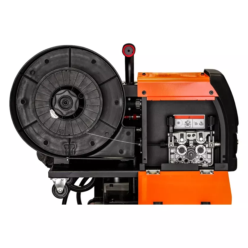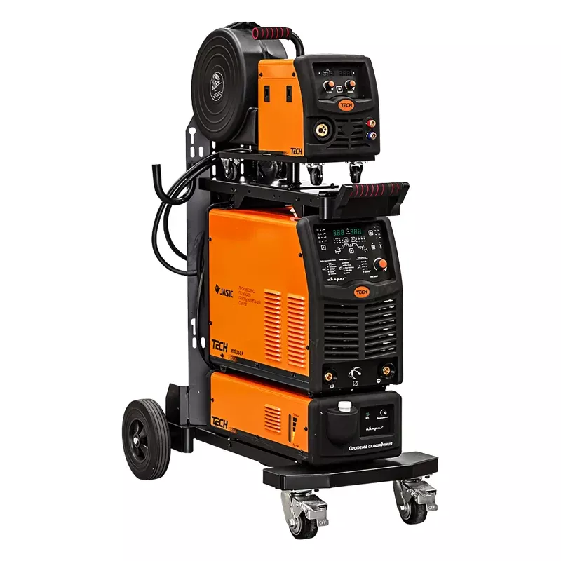 - Блочная система на прочной тележке: источник сварочного тока, подающее устройство и теплообменник