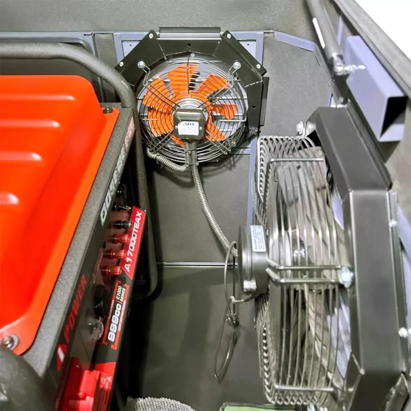 Мощная вентиляция - залог успешной работы генератора в кожухе. Вентилятор - обеспечивает нормальный тепловой режим работы генератора. При работе генератора окружающий воздух нагревается от корпуса двигателя. В небольшом пространстве кожуха для дизельного или бензинового генератора при отсутствии вентиляции воздух способен нагреться до 90-100 градусов через несколько минут после запуска электроустановки. При этом расплавляются пластиковые детали механизмов генератора, это ведет к перегреву двигателя. Для предотвращения повреждения генератора, необходимо применение электрических вентиляторов для принудительной циркуляции охлаждающего воздуха. Мы устанавливаем промышленный осевой вентилятор (220В, 135 Вт, 2670 м3/час), который с запасом рассчитан на обеспечение максимального теплоотвода для данной модели кожуха. Во всех изделиях уличного исполнения применяются высоко производительные вентиляторы со скоростью вращения 1350 об/мин.