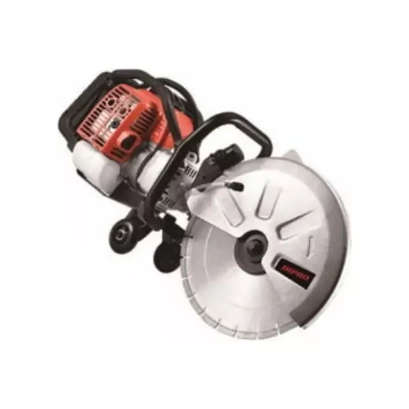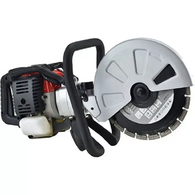 Двухтактный бензиновый двигатель объемом 63 см3. Для длительной эксплуатации без дозаправки оборудован топливный бак емкостью 1,3 л. Распыление воды в зону реза производит охлаждение и увеличивает срок эксплуатации аппарата. Управление производится удобными рукоятями. Инструмент рассчитан на эксплуатацию с режущим диском диаметром 420 мм.