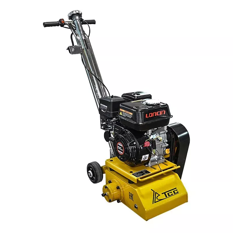 Четырехтактный одноцилиндровый бензиновый двигатель Loncin G200F мощностью 6,5 л.с. оснащен датчиком уровня масла. Во избежание поломки мотор строительной фрезеровальной машины TSS-MS8-L не запускается, если смазки в картере недостаточно. Расход топлива составляет 1,4 л/ч. Заправка полного бака обеспечивает непрерывную работу в течение 2,5 часов.
