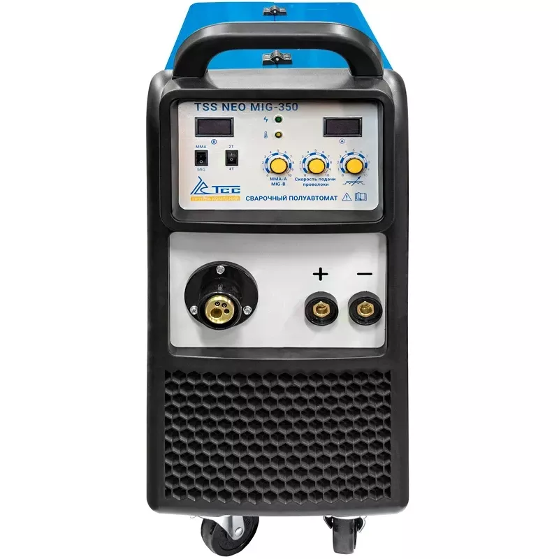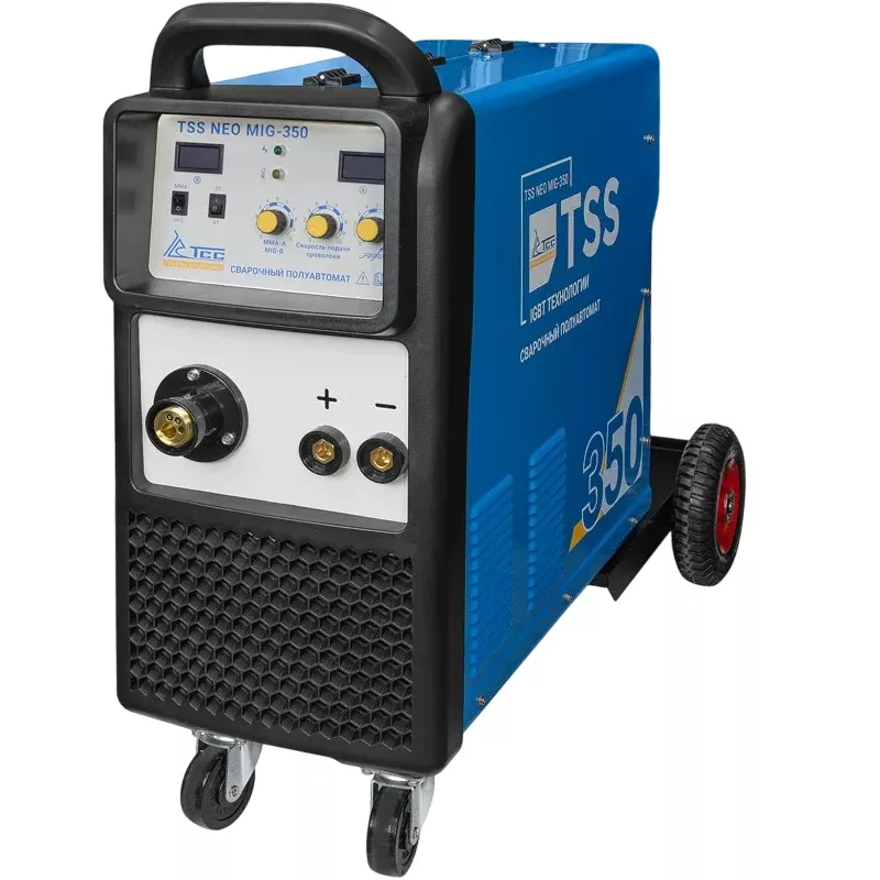 TSS NEO MIG-350 - Сварочный полуавтомат инверторный. Корпус из листовой стали, надежно защищает внутренние элементы от повреждения. Предназначен для полуавтоматической сварки в среде защитных газов (MIG/MAG), а также ручной дуговой сварки покрытым электродом (ММА). Аппарат имеет защиту от перегрузки, индикатор перегрева и неисправности, обеспечивая высокий уровень безопасности и надежность устройства. Так же данный аппарат имеет защиту от скачков напряжения. Высокое напряжение холостого хода обеспечивает легкость поджига сварочной дуги. Высокая стабильность сварки в реальном времени, простое интуитивно понятное управление сварочными параметрами.