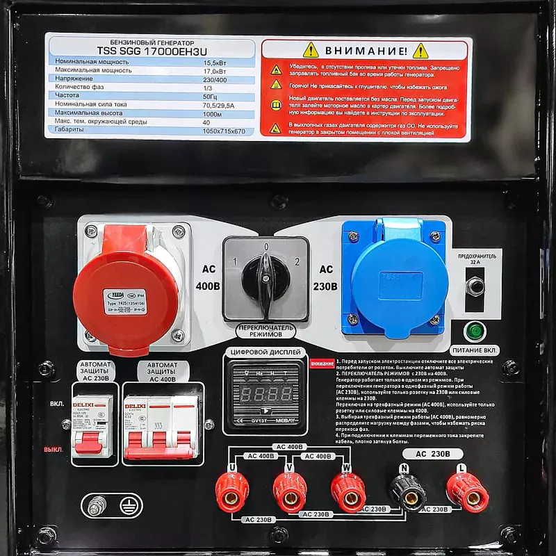 Автоматический регулятор напряжения обеспечивает стабильную работу генератора ТСС SGG 17000EH3U за счет повышения или понижения выходных параметров. Индикаторы и датчики топливной и масляной системы помогают контролировать состояние станции. Электронный блок аварийной защиты отключает генератор в случае перегрузки и низкого уровня масла. Прерыватель цепи позволяет быстро отключить ток в экстренном случае.