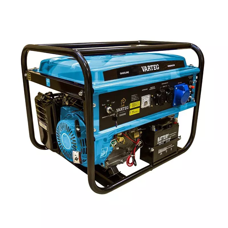 Бензиновый генератор Varteg G6500 E - простой в применении резервный источник электричества на силовой раме классической компоновки для стационарного использования. Предназначен для обеспечения резервным электричеством бытовых приборов. Оборудован электрозапуском (запуском с ключа). Может обеспечить светом и электричеством небольшой загородный дом во время его отключения от основной электросети.