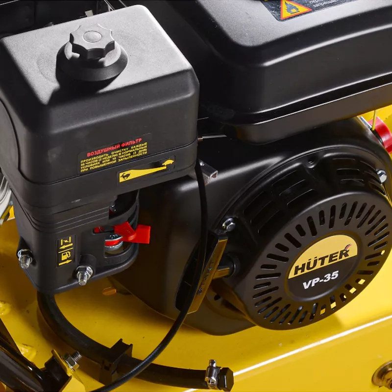 Виброплита Huter VP-35 мощностью 6,5 л.с. подходит для обработки материалов из асфальта, бетона и грунта. Центробежная сила составляет 25 кН, что обеспечивает быстрое и качественное уплотнение.