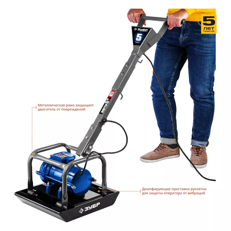 Виброплита ЗУБР ЗВПЭ-5 Г мощностью 550 Вт подходит для обработки материалов из асфальта, бетона и грунта. Центробежная сила составляет 5 кН, что обеспечивает быстрое и качественное уплотнение.