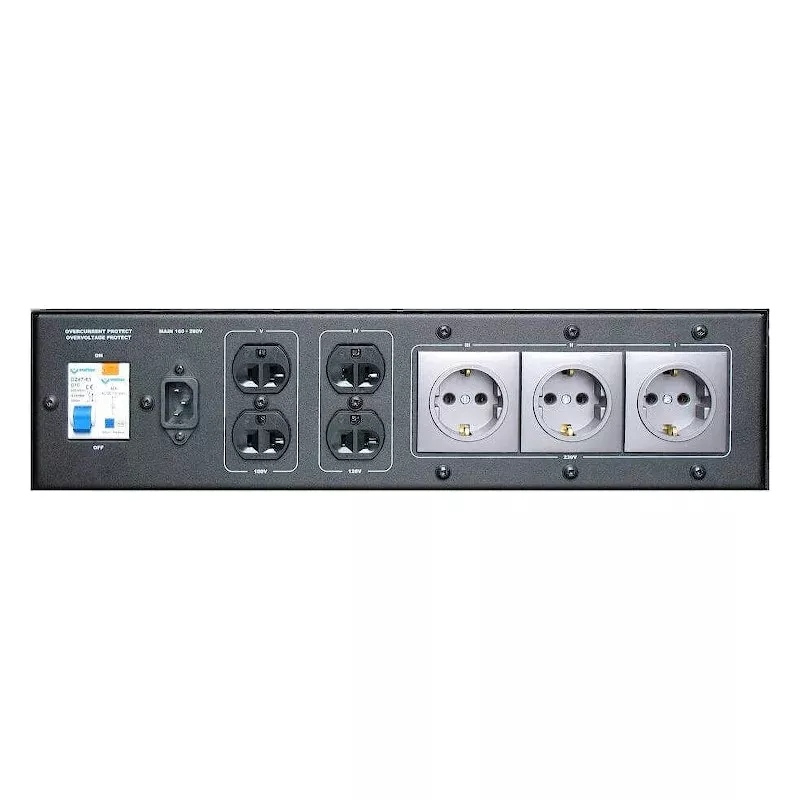 - С помощью кнопок на передней панели,можно изменять среднее выходное напряжение, время задержки на включение групп розеток и настраивать таймер автоматического включения/выключения. .