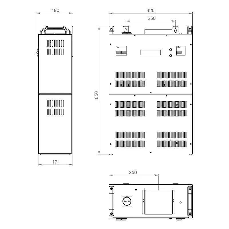 Для удобства переноски стабилизаторов имеются ручки. На лицевой панели корпуса расположен ЖК-индикатор, отображающий значения входных и выходных напряжений и токов, как в режиме «стабилизация», так и в режиме «транзит», автоматический выключатель.