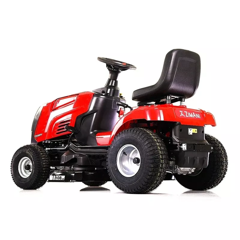 Садовый трактор ZimAni TS108HV — многофункциональная самоходная машина с сиденьем оператора, оборудованная двигателем Loncin мощностью 18 л.с. и предназначенную для комплексного ухода за газонами. Профессиональная гидростатическая трансмиссия обеспечивает легкое управление на территориях со сложным рельефом. Трактор эффективно справляется с обработкой газонов площадью 5000 м2 на одной заправке бензобака благодаря большой ширине режущего механизма 108 см и возможности скашивания на заднем ходу.