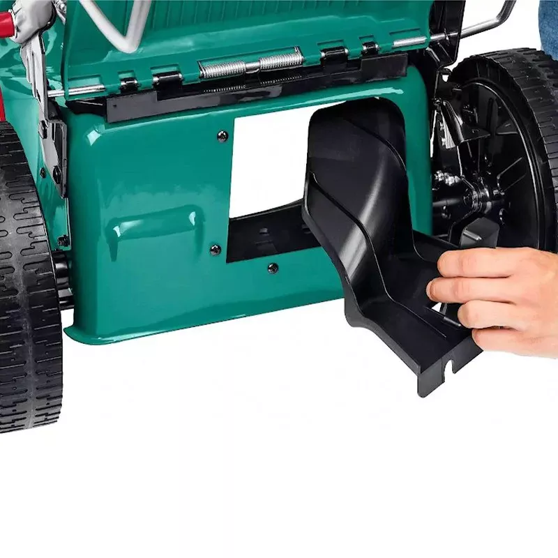 Высота резки регулируется специальным рычагом, который находится в правой задней части корпуса. Регулировка центральная - для подъема и опускания режущей части машины не требуется настройка каждого колеса. Изменение высоты стрижки позволяет стричь траву как на декоративном газоне, так и на лужайке для барбекю.