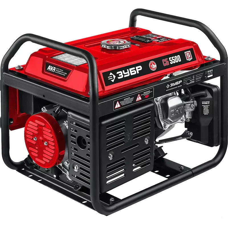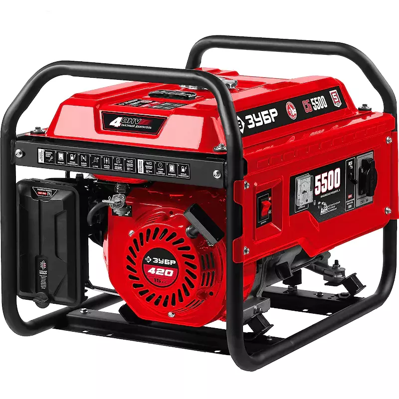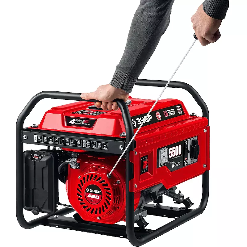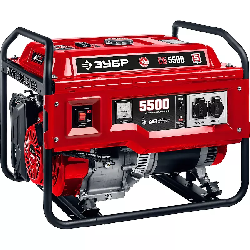 Бензиновый генератор ЗУБР СБ-5500 служит резервным источником электроэнергии для бытовых приборов, электроинструментов и систем освещения. Устройство оснащено двумя розетками 220 В, позволяет подключить несколько потребителей общей мощностью до 5,5 кВт.