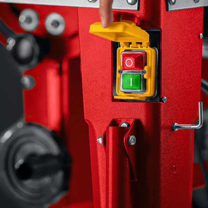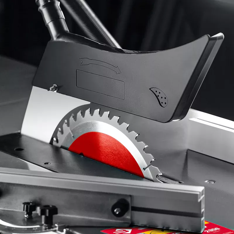 Электромагнитный выключатель оснащен защитой от случайного включения. При восстановлении отключенного электроснабжения необходимо заново нажать кнопку питания. Подпружиненный защитный кожух закрывает вращающийся пильный диск во время пиления. Расклинивающий нож устраняет последствия заклинивания зубьев пилы в материале в случае смещения заготовки.